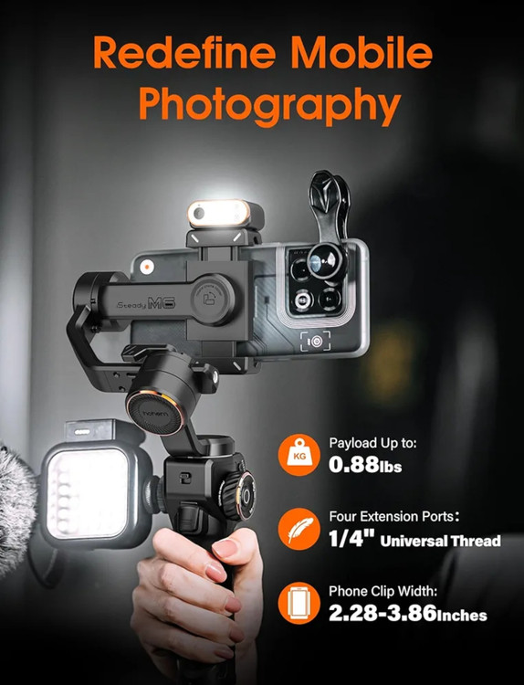 [الگوریتم تثبیتکننده نسل هفتم iSteady] با تثبیتکننده 3 محوره و فناوری لرزشگیر iSteady 7.0، این گیمبال تلفن یک تغییر دهنده بازی برای سازندگان محتوا در همه سطوح است. اکنون میتوانید لحظات نفسگیر را با ثبات و نرمی بینظیر ثبت کنید، چه فیلمبرداری از پروژه پرشور خود، چه فیلمبرداری از زندگی روزانهتان، جریان ماجراجوییهایتان یا گرفتن سلفیهای خیرهکننده. محتوای خود را با گیمبال تلفن iSteady M6 ارتقا دهید. اکنون مال خود را بگیرید و فیلمساز درونی خود را آزاد کنید!