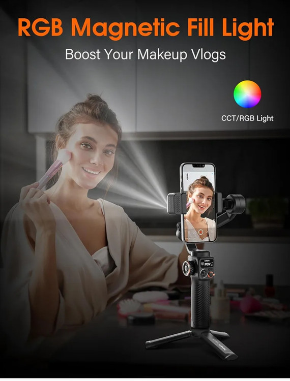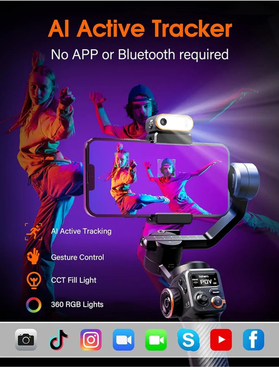 تثبیت کننده گوشی هوشمند [ردیاب هوش مصنوعی با نور پرکننده قابل تنظیم] کیت hohem M6 به یک ردیاب هوش مصنوعی خلاقانه مجهز شده است که می تواند بدون اتصال بلوتوث و محدودیت برنامه، ردیابی چهره/بدن را به آرامی انجام دهد. حسگر بینایی هوش مصنوعی را می توان با حرکات اختصاصی فعال یا غیرفعال کرد و اطمینان حاصل کرد که سوژه همیشه در کادر است. نور پرکننده CCT/RGB قابل تنظیم با روشنایی از نور سرد و گرم و رنگهای محیطی 360 RGB پشتیبانی میکند و عکاسی در محیطهای کم نور را آسان میکند.