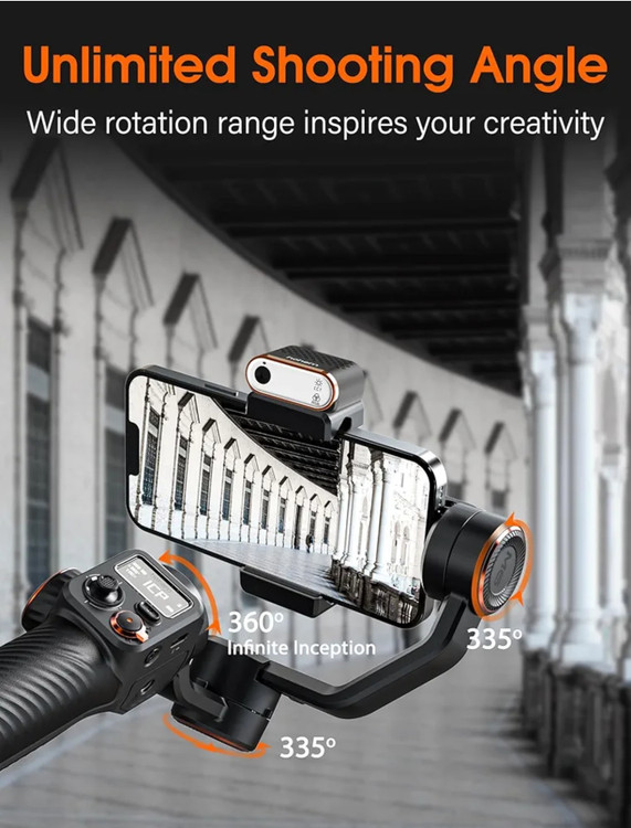 [زاویه عکسبرداری نامحدود] حالت تازه توسعه یافته "Inception" را با تثبیت کننده تلفن برای ضبط ویدئو تجربه کنید! این حالت به شما امکان می دهد هنگام عکاسی بدون محدودیت برنامه، گوشی خود را 360 درجه به صورت عمودی و بی نهایت بچرخانید. جهت چرخش و جهت چرخش می تواند به زاویه چرخش بزرگ 335 درجه برسد، بنابراین دیگر نیازی نیست نگران زوایای محدود و کادربندی ناقص باشید. با گیمبال آیفون، به راحتی می توان عکس های پویا و خلاقانه ایجاد کرد و هیچ پشیمانی ندارید.