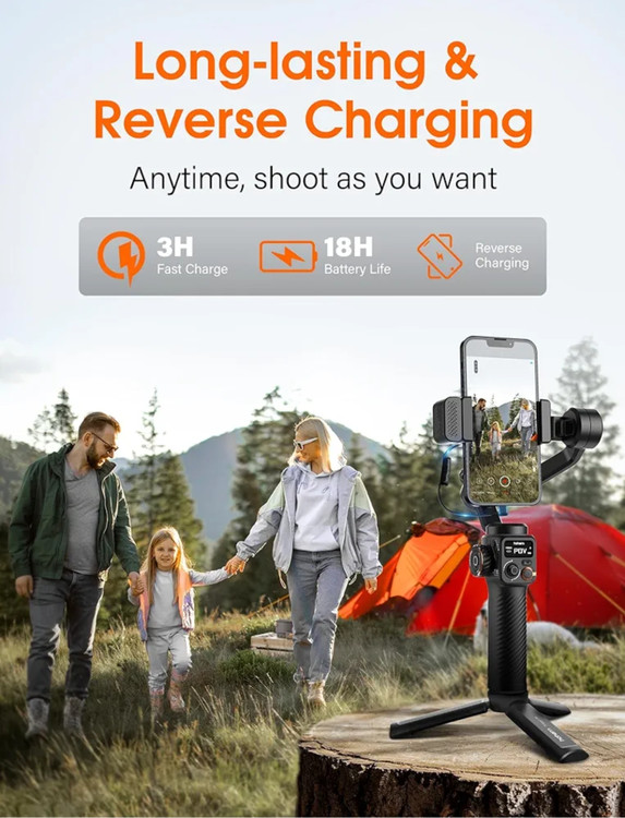 [باتری با ماندگاری 18 ساعت و شارژ معکوس] با 18 ساعت عمر باتری طولانی، میتوانید بدون نگرانی از اینکه گیمبال در نیمهی راه عکاسی از بین میرود، وقت خود را برای گرفتن عکس عالی صرف کنید. علاوه بر این، گیمبال تلفن دارای قابلیت شارژ معکوس است که به شما امکان می دهد تلفن خود را مستقیماً از گیمبال شارژ کنید، و شما را از اضطراب کم باتری در حال حرکت نجات می دهد. و می توانید وضعیت برق و وضعیت کار و غیره را به صورت بلادرنگ در صفحه نمایش بزرگ OLED 0.91 اینچی بررسی کنید.