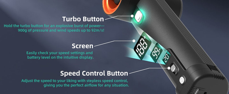 دارای یک موتور توربین پرسرعت 785 واتی است که سرعت باد 205 MPH/331 کیلومتر در ساعت را برای عملکرد قدرتمند به عنوان فن دمنده هوا خشک کن خودرو و دمنده برگ ایجاد می کند.