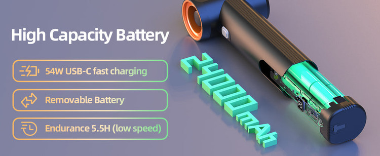 این دمنده هوای خشک کن دستی با باتری 24000 میلی آمپر ساعتی (4000 میلی آمپر ساعت * 6S) قابل جدا شدن، تا چندین ساعت استفاده را در یک نسیم ملایم و دور کند تضمین می کند. از شارژ سریع 54 واتی USB-C پشتیبانی میکند و امکان شارژ مجدد سریع را فراهم میکند تا شما را برای مدت طولانیتری در حالت شارژ نگه دارد.