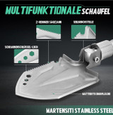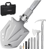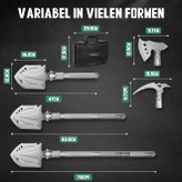 بیل تاشو چند منظوره - این بیل کمپینگ را می توان آزادانه برای رفع زاویه چرخاند و می توانید آن را به یک بیل، قلاب یا بیل تبدیل کنید تا نیازهای مختلف خود را برآورده کند. در کنار بیل تاشو دندانه ها و لبه های اره تیز و همچنین سه اندازه مختلف دهانه آچار برای انجام کارهایی مانند بریدن شاخه ها، بریدن طناب ها یا پیچ کردن پیچ وجود دارد.