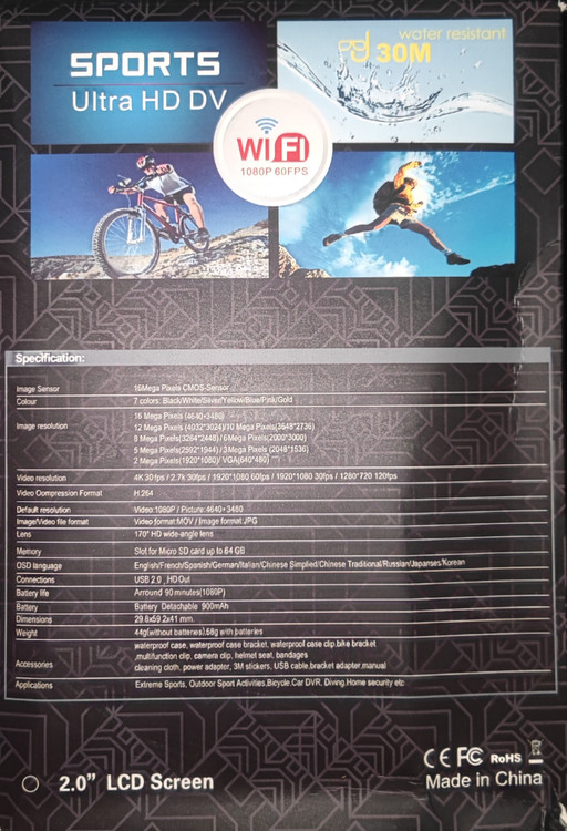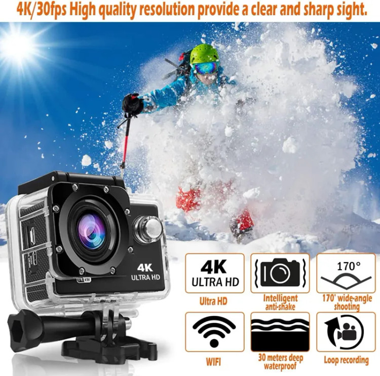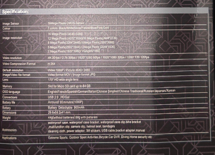 پارجه تميز كننده، آدايتور برق، برجسب هاى 3M، كابل USB، آدايتور براكت، دفترجه راهنما ورزش هاى شديد، فعاليت هاى ورزشى در فضاى باز، دوجرخه، ماشين DVR، غواصى، امنيت خانه و غيره