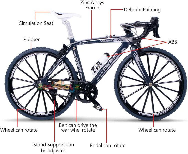 اسباببازی بامزه، کلکسیون ظریف، این مینیدوچرخه شبیهسازی شده، چرخها، پدالها، دسته و پایه آن میتوانند مانند یک دوچرخه واقعی حرکت کنند، بچهها عاشق آن به عنوان اسباببازی نمایشی هستند و همچنین انتخابی عالی برای کلکسیونهای ظریف یا دکوراسیون منزل است.