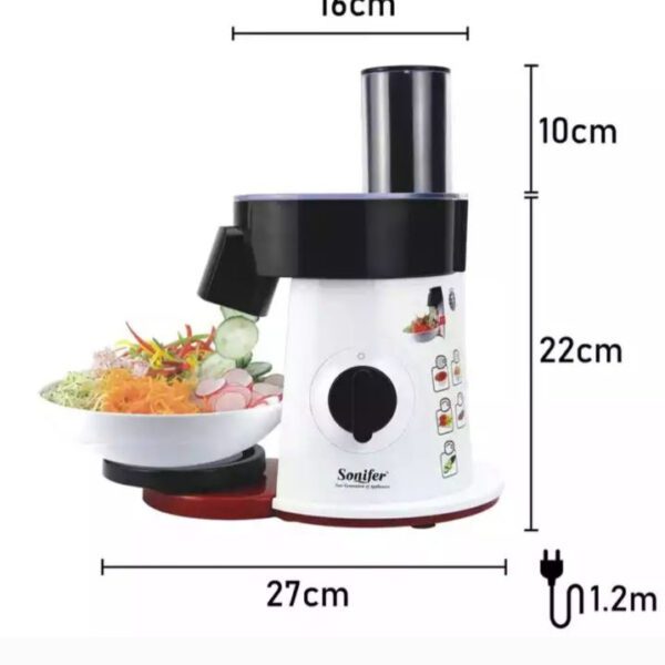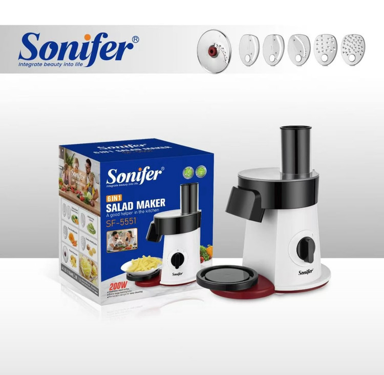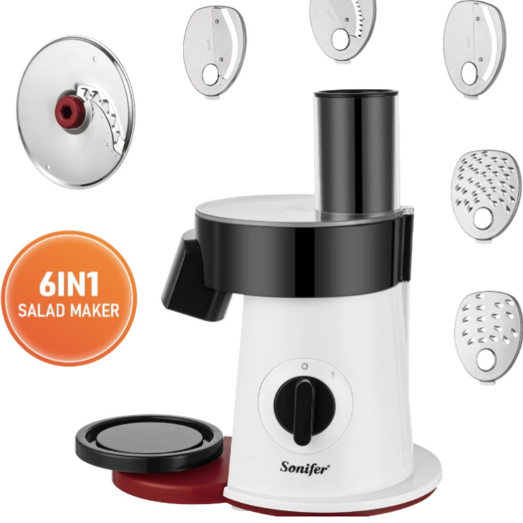 سالاد سازها می توانند با سرعتی معین سبزیجات را به یک سایز برش دهند، در واقع این وسایل برادر کوچک غذا سازها می باشند اما از نظر امکانات محدودتر هستند. طراحی سالاد سازها به گونه ای است که در همان نگاه اول می توان طرز کار با آن را یاد گرفت و با توجه به سایز دهانه ورودی دستگاه می توان از آن برای برش زدن و قطعه کردن انواع مواد غذایی استفاده کرد. کمپانی سونیفر با در نظر گرفتن این نیاز، سالاد سازی تولید کرده است که با آن میتوان انواع مواد غذایی را با پنج تیغه ای که برای آن در نظر گرفته است برش زد. این سالاد ساز دارای پنج دیسک برای برش نازک، ضخیم، خلال، رنده ریز و درشت دارد. یکی از مزایای مهم در این نوع سالاد ساز قدرت موتور، جنس و نوع تیغه های آن می باشد، موتور این سالاد ساز دارای تنظیمات دو سرعته می باشد و همچنین جنس تیغه ها نیز از استیل ضد زنگ می باشند و زمانی که با قدرت موتور بالا ترکیب می شوند توانایی خرد کردن انواع مواد غذایی را دارند. همچنین این سالاد ساز قابلیت جدا سازی قطعات دارد و پس از کار می توان تک تک اجزای آن را شسته و از تمیزی آن اطمینان خاطر داشت.